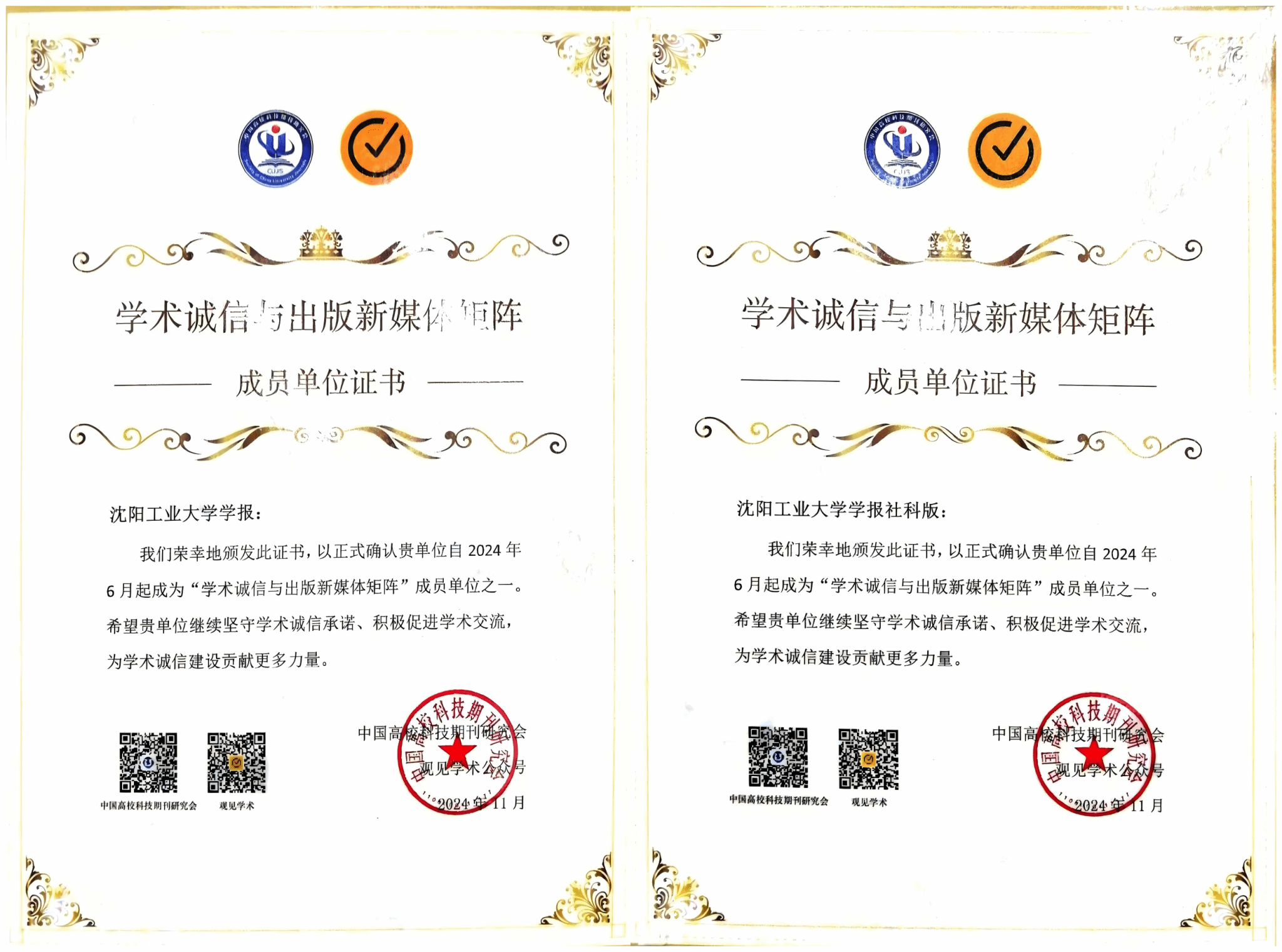 12月16日,中國(guó)高校科技期刊研究會(huì)第28次年會(huì)發(fā)布了“2024年度中國(guó)高校科技期刊建設(shè)示范案例庫(kù)·杰出/百佳/優(yōu)秀科技期刊”入庫(kù)案例,評(píng)選出“優(yōu)秀”案例284個(gè),《沈陽(yáng)工業(yè)大學(xué)學(xué)報(bào)》位列其中。此外,年會(huì)同時(shí)發(fā)布了140家“學(xué)術(shù)誠(chéng)信與出版新媒體矩陣”首批成員名單,《沈陽(yáng)工業(yè)大學(xué)學(xué)報(bào)》自然版與社科版雙雙入選。