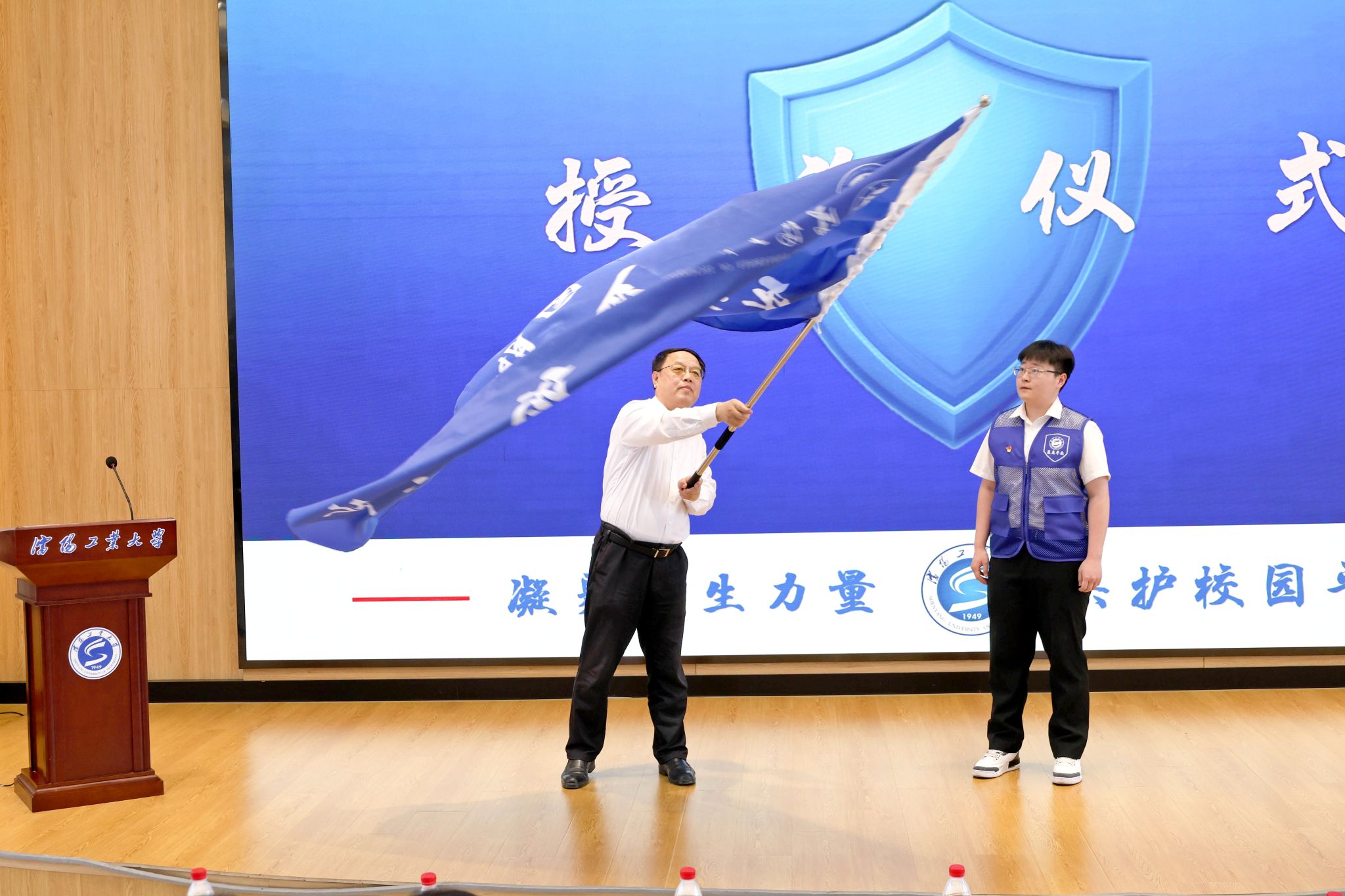為有效健全校園安全防控體系,切實發揮廣大學生在平安校園建設中的積極作用,強化自我教育、自我管理、自我服務職能和群防群治、聯防聯治優勢,打造平安和諧校園,保障高質量發展,6月6日下午,學校在教學樓E301舉行了沈陽工業大學藍盾平安校園服務大隊授旗儀式。黨委書記賈玉明出席并講話,沈陽市公安局駐校專員、開發區消防大隊專職參謀、學校相關職能部門負責人、各學院學生工作負責人參加會議。會議由黨委常委、副校長王彪主持。
