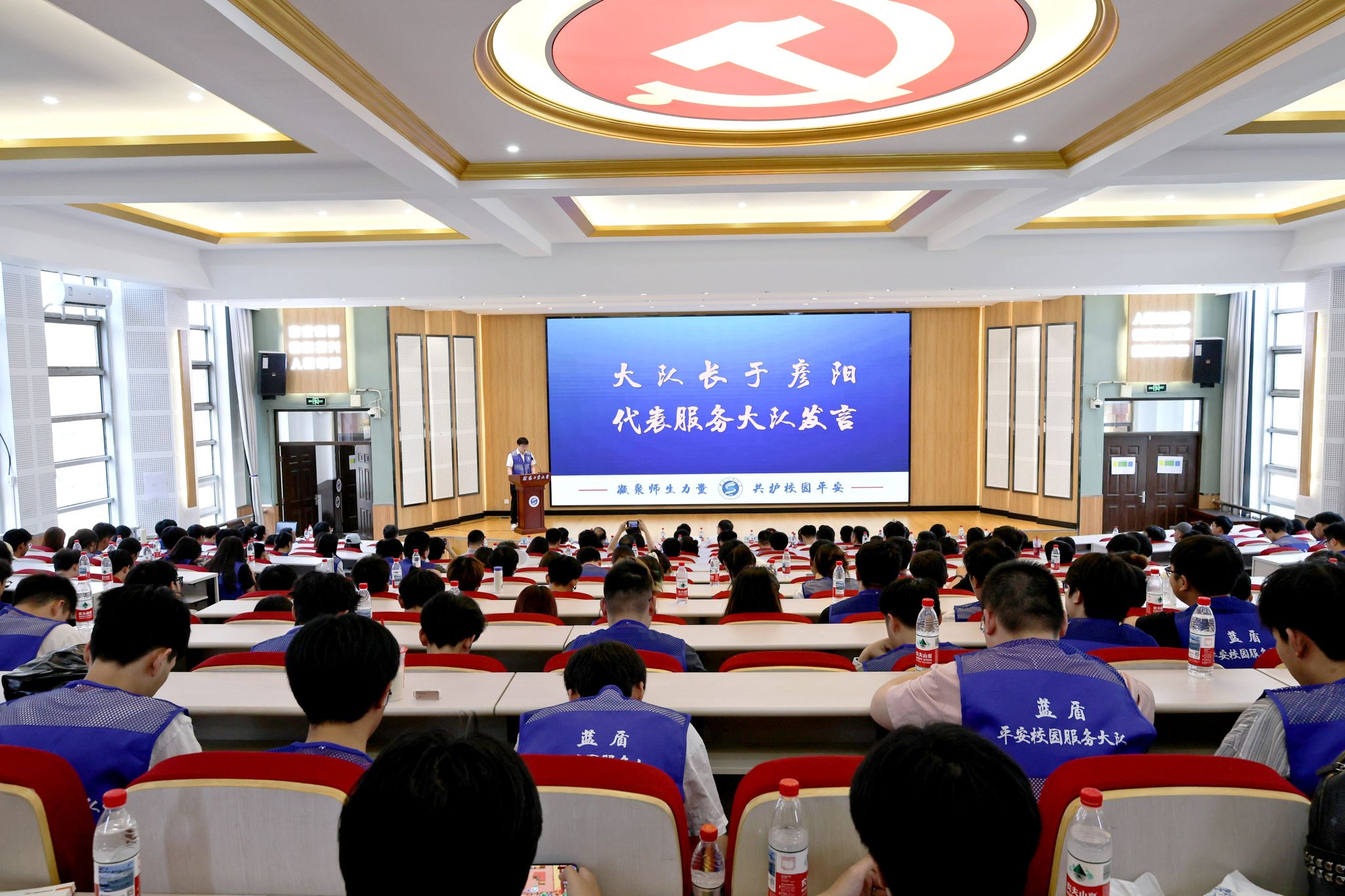 會上,校團委書記陳文波宣讀了藍盾平安校園服務大隊成立批復文件,黨委保衛部部長李杰作為指導教師發言,大隊長于彥陽代表服務大隊發言并帶領現場全體隊員代表莊嚴宣誓。