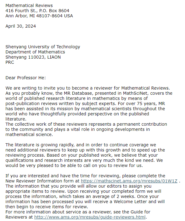 近日, 理學院數學系何立國教授收到美國數學評論(Mathematical Review) 執行主編 Edward G. Dunned 的聘請郵件,被聘為美國數學評論的評論員(評論員編號:176890),是我校教師首次成為國際權威數學文摘雜志評論員。
