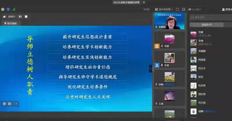 4月7日,理學院召開了全體研究生導師工作線上會議。學院領導班子全體成員、全體研究生導師、輔導員以及教學秘書參加會議。會議由學院黨總支書記李媛媛主持。