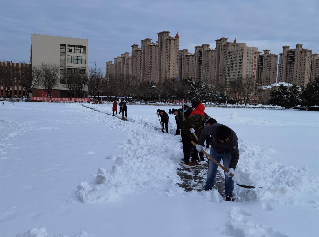 掃雪現(xiàn)場,大家齊心協(xié)力,你推我鏟,默契配合,干勁十足。重點(diǎn)對校部樓周邊人行道、停車場以及通往食堂的道路進(jìn)行清理。經(jīng)過近兩個(gè)小時(shí)的努力,順利完成除雪任務(wù)。