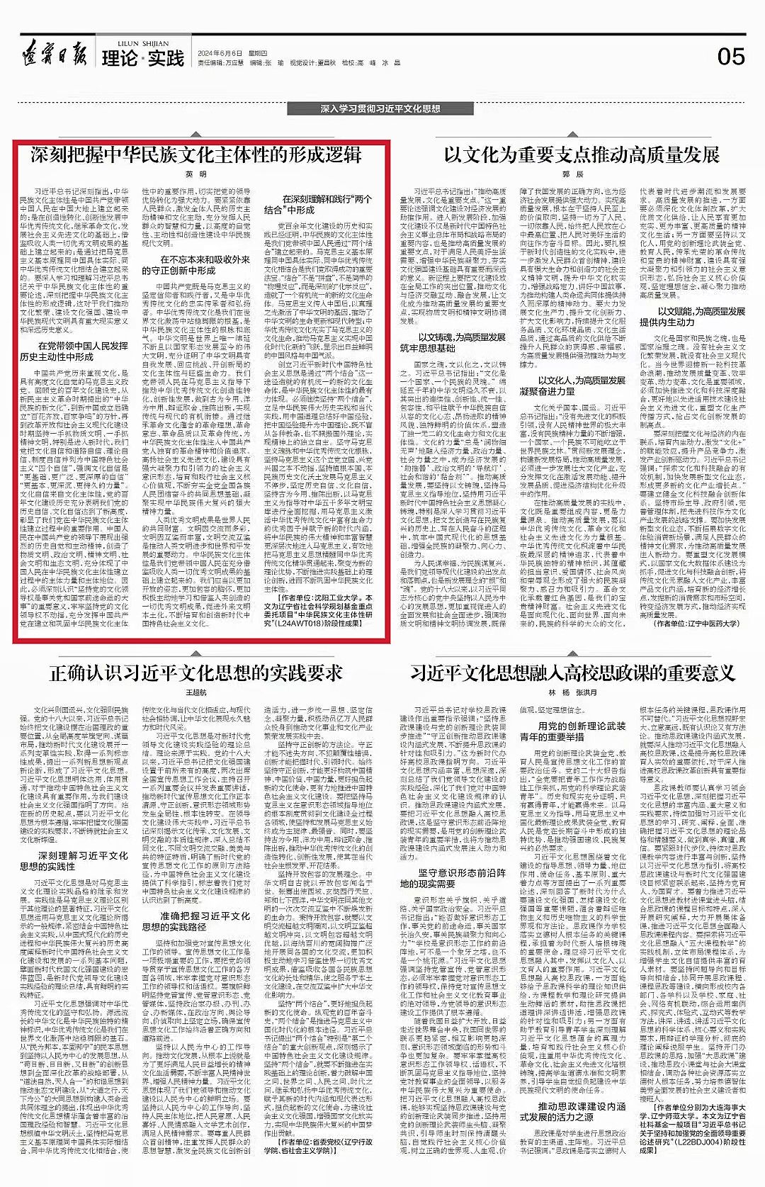 習近平總書記深刻指出,中華民族文化主體性是中國共產黨帶領中國人民在中國大地上建立起來的;是在創造性轉化、創新性發展中華優秀傳統文化,繼承革命文化,發展社會主義先進文化的基礎上,借鑒吸收人類一切優秀文明成果的基礎上建立起來的;是通過把馬克思主義基本原理同中國具體實際、同中華優秀傳統文化相結合建立起來的。要深入學習和理解習近平總書記關于中華民族文化主體性的重要論述,深刻把握中華民族文化主體性的形成邏輯,這對于我們推動文化繁榮、建設文化強國、建設中華民族現代文明具有重大現實意義和深遠歷史意義。