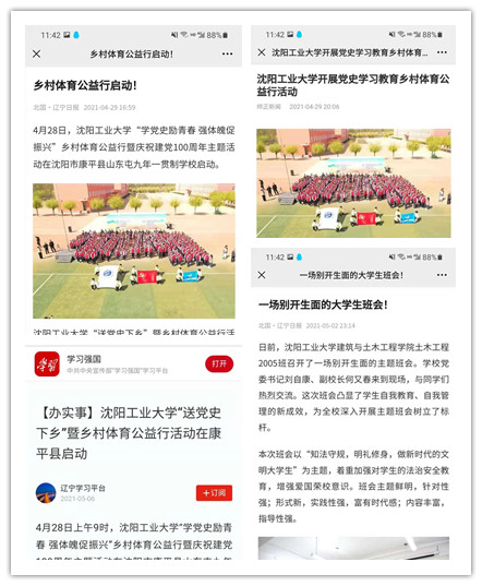 4月29日,遼寧日報客戶端報道了我校“學黨史勵青春 強體魄促振興”鄉(xiāng)村體育公益行暨慶祝建黨100周年主題活動。同時,沈陽日報客戶端、“學習強國”遼寧頻道也分別于4月29日和5月6日對此活動進行報道。