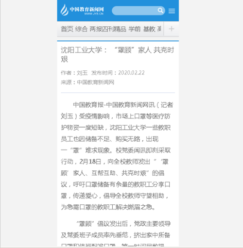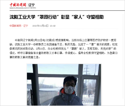 2月22日,《中國(guó)教育報(bào)》-中國(guó)教育新聞,中國(guó)新聞網(wǎng)遼寧頻道,今日頭條網(wǎng)站等多家媒體報(bào)道了我校“罩顧”家人愛(ài)心行動(dòng)和近期疫情防控工作。文中指出,受疫情影響,市場(chǎng)上口罩等醫(yī)療防護(hù)物資一度短缺,沈陽(yáng)工業(yè)大學(xué)一些教職員工出現(xiàn)一“罩”難求現(xiàn)象。校黨委聞?dòng)嵓纯滩扇⌒袆?dòng),2月18日,向全校教師發(fā)出“‘罩顧’家人、互幫互助、共克時(shí)艱”的倡議,呼吁口罩儲(chǔ)備有余量的教職工分享口罩,傳遞愛(ài)心,倡導(dǎo)全校教師守望相助。倡議發(fā)出后,黨政主要領(lǐng)導(dǎo)及常委班子成員率先垂范,擠出家中所備口罩和值班配發(fā)口罩,第一時(shí)間盡數(shù)捐出,廣大師生、校友紛紛參與和支持,為急需口罩的教職工解決燃眉之急。