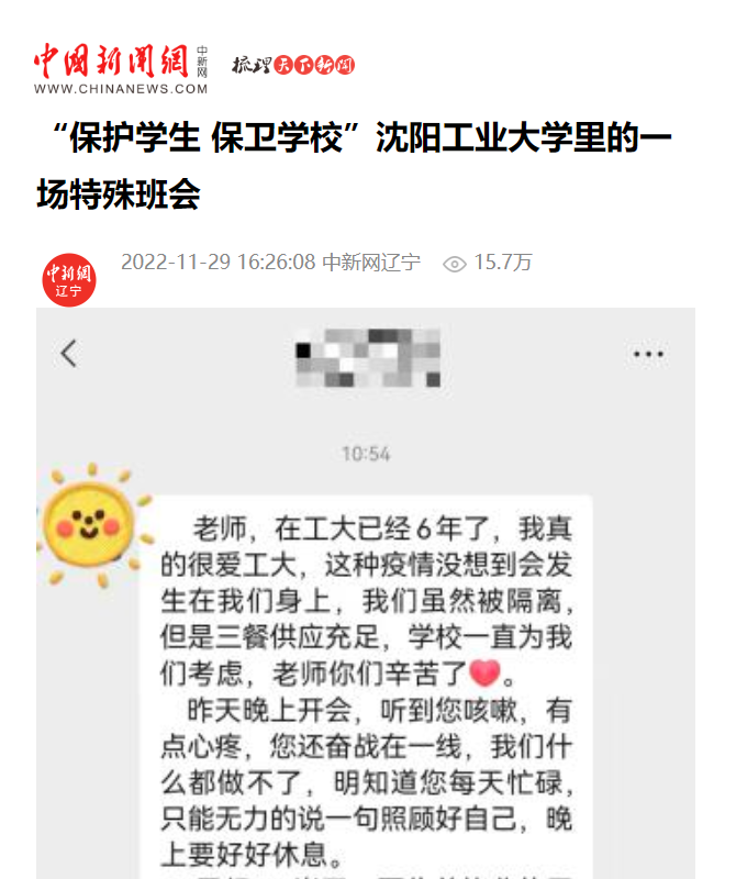 疫情發生以來,像周老師一樣,沈陽工業大學老師們都心急如焚,駐校堅守日夜奮戰,與同學們同吃同住,全力做好疫情防控和服務保障,恨不能速戰速決,讓校園“一鍵復原”。工作專班夜以繼日,800余名教職員工堅守“疫”線,只為同學們能過得好一點,疫情消滅的快一點。周老師自己就是駐校堅守的一員,他拋下自家剛2個月的孩子,守護工大的孩子,而這樣舍小家為大家的老師遠不止他一個。除了駐守校內的老師,學校還成立了校外隔離學生保障專班,他們不懼危險入駐各個安置點,守護在學生身邊,關注學生思想狀況、疏導情緒,協調解決醫療和生活需求,保障同學們的學習生活。在全校的共同努力下,目前,學校疫情已得到有效控制,物資供應、生活服務等保障逐步到位,校園運轉平穩有序。