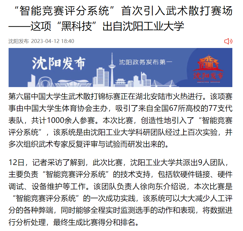 第六屆中國(guó)大學(xué)生武術(shù)散打錦標(biāo)賽正在湖北安陸市火熱進(jìn)行。該項(xiàng)賽事由中國(guó)大學(xué)生體育協(xié)會(huì)主辦,吸引了來(lái)自全國(guó)67所高校的77支代表隊(duì),共計(jì)1000余人參賽。本次比賽,創(chuàng)造性地引入了“智能競(jìng)賽評(píng)分系統(tǒng)”,該系統(tǒng)是由沈陽(yáng)工業(yè)大學(xué)科研團(tuán)隊(duì)經(jīng)過(guò)上百次實(shí)驗(yàn),并多次組織武術(shù)專(zhuān)家反復(fù)評(píng)審與試驗(yàn)而研發(fā)出來(lái)的。