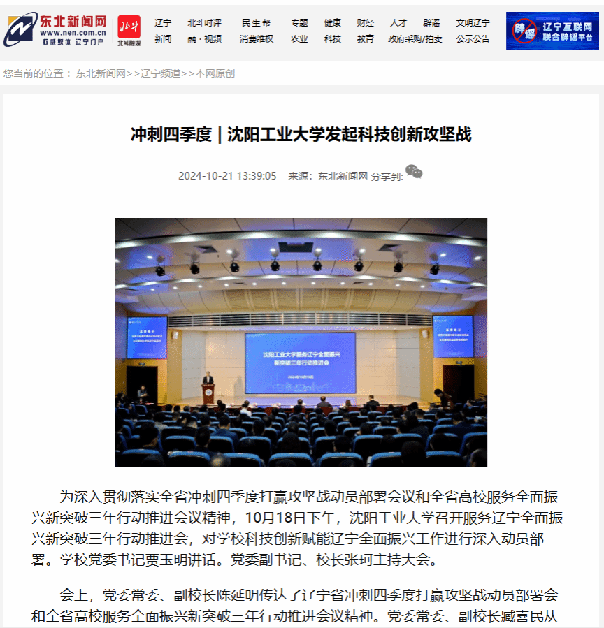 為深入貫徹落實(shí)遼寧省全省沖刺四季度打贏攻堅(jiān)戰(zhàn)動(dòng)員部署會(huì)議和全省高校服務(wù)全面振興新突破三年行動(dòng)推進(jìn)會(huì)議精神,10月18日下午,沈陽工業(yè)大學(xué)召開服務(wù)遼寧全面振興新突破三年行動(dòng)推進(jìn)會(huì)。大會(huì)的舉行引起了廣泛的關(guān)注,產(chǎn)生了強(qiáng)烈反響,中國教育報(bào)、中國工業(yè)新聞網(wǎng)、東北新聞網(wǎng)、遼望、遼寧省教育廳等媒體平臺(tái)相繼報(bào)道。
