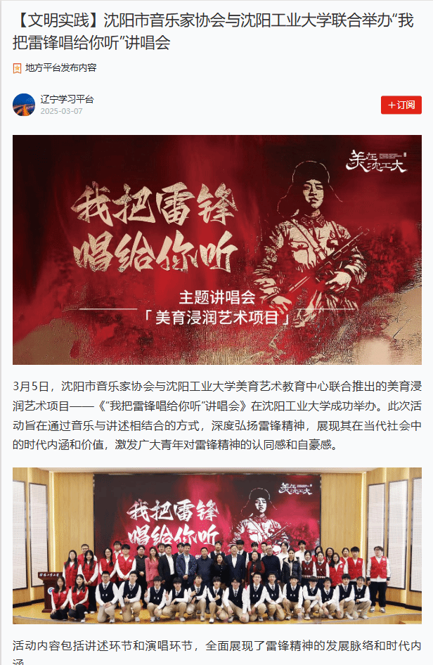 為進一步弘揚雷鋒精神,沈陽工業大學在新學期到來之際舉辦“弘揚雷鋒精神,奮斗成就夢想”2025年春季“開學第一課”系列活動,多家媒體對此活動進行報道。