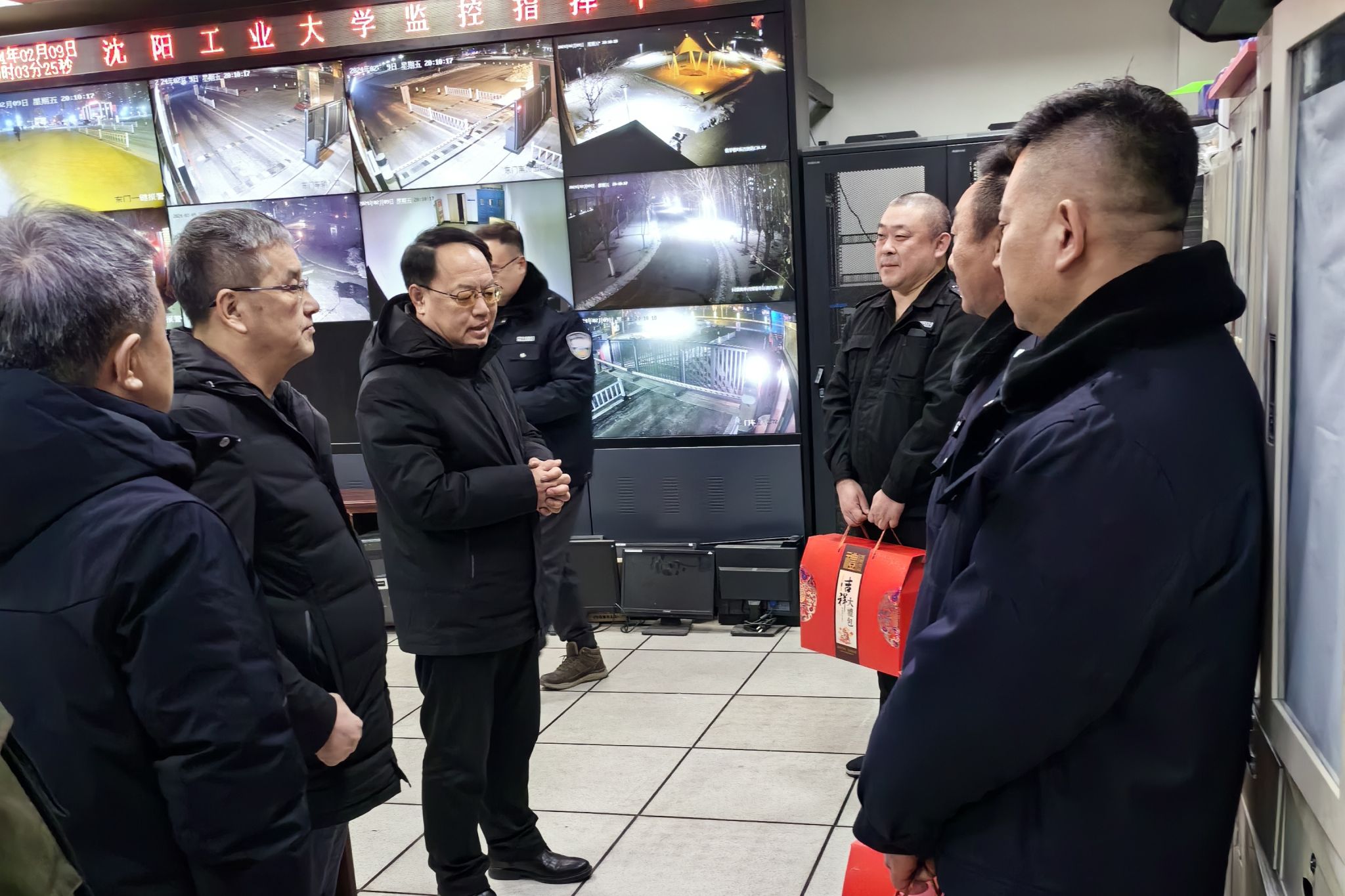 在中央校區(qū),校領(lǐng)導一行先后來到校園監(jiān)控指揮中心、校門、變電所、學生宿舍等地。每到一處,校領(lǐng)導都親切地與一線教職工交流互動、送上祝福,深入了解值班值守的工作安排、實際運行、應(yīng)急方案等情況,并要求相關(guān)部門要全力保障好一線職工的生產(chǎn)生活,確保大家安心抓好崗位工作并舒心歡度春節(jié)。校領(lǐng)導對值守教職員工兢兢業(yè)業(yè)的工作態(tài)度和無私奉獻精神給予高度評價,對大家一年來的辛勤付出表示衷心感謝,對大家所取得的成績表示欣慰。賈玉明和張珂仔細詢問他們的工作和生活情況,感謝他們舍小家為大家,犧牲與家人團聚時間,堅守崗位、認真履職。賈玉明強調(diào),安全保衛(wèi)和后勤工作是學校運行的基礎(chǔ),關(guān)系全校師生身體健康和切身利益,希望大家以高度的責任心和飽滿的工作熱情堅守崗位、恪盡職守,守好校園。張珂指出,要時刻緊繃安全這根弦,嚴格值班備勤,做好寒假春節(jié)期間校園安全和消防各項工作,確保度過一個安全祥和愉快的春節(jié)和寒假假期。