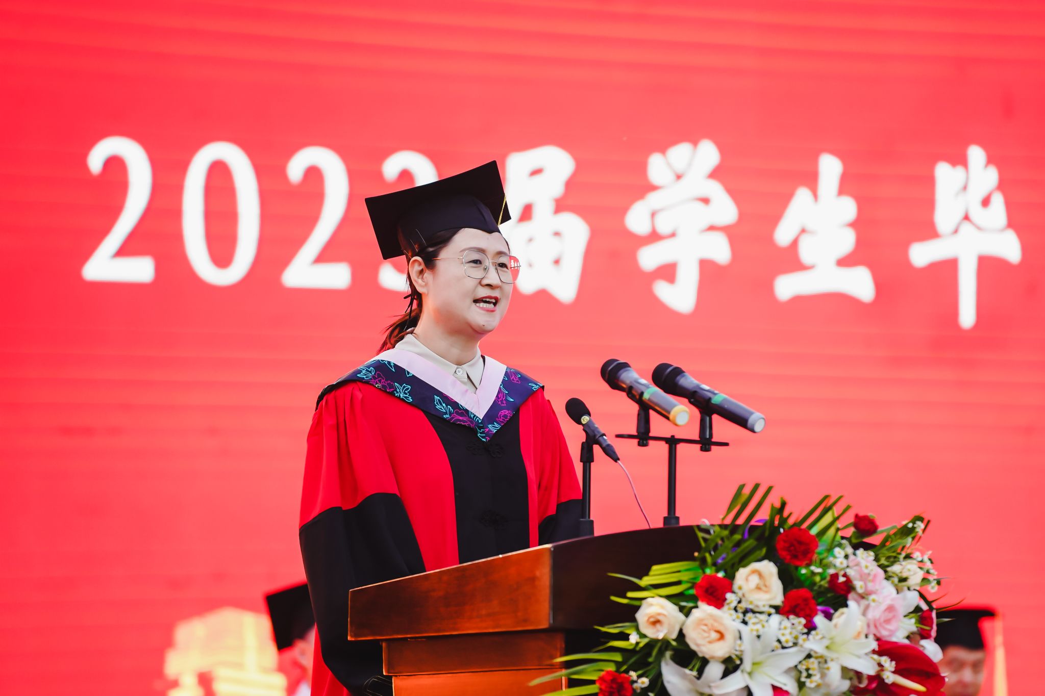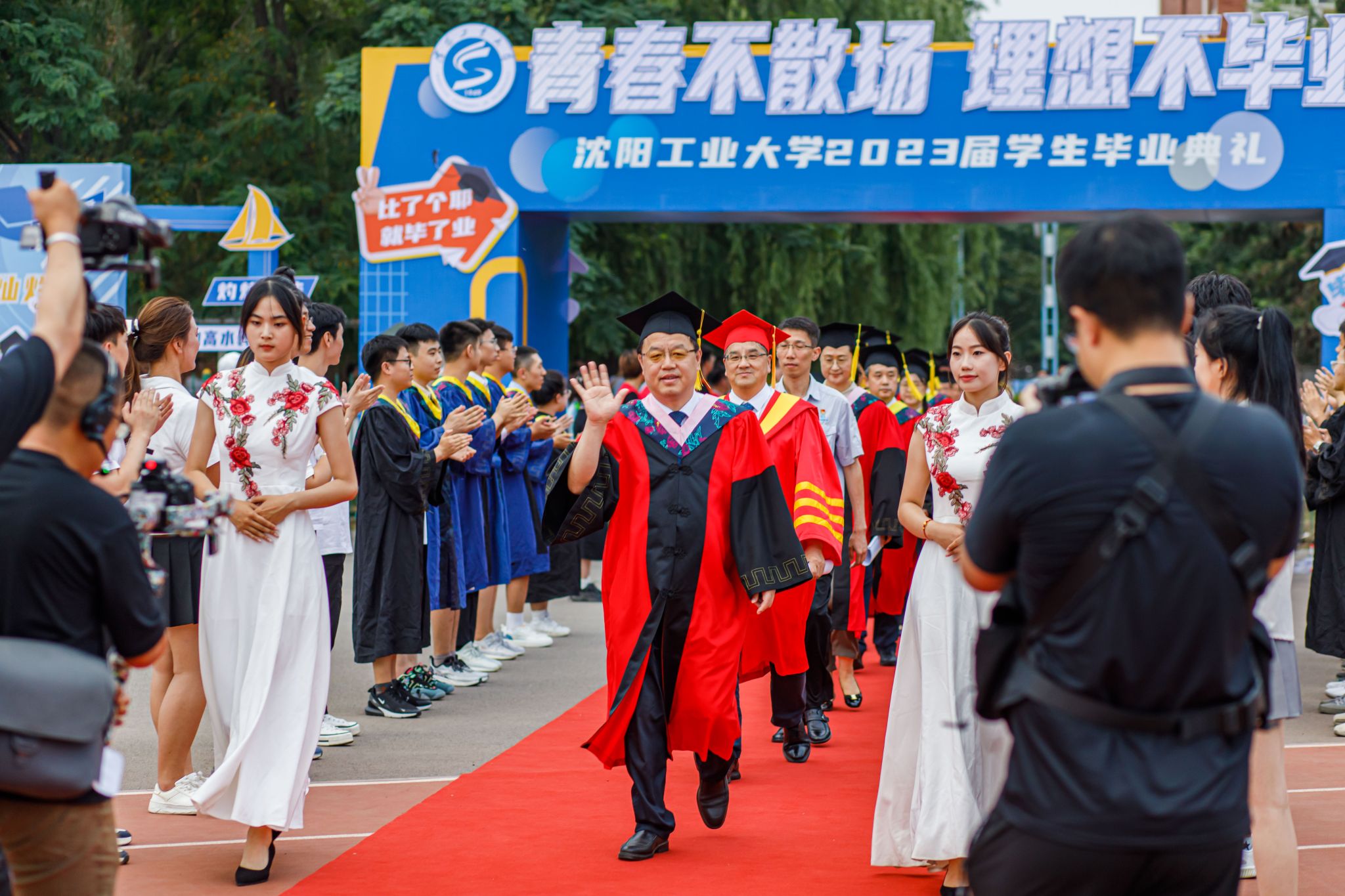 在全場熱烈掌聲和歡呼聲下,中國工程院院士唐任遠教授,黨的二十大代表、大國工匠年度人物洪家光校友,校領導以及校學術委員會全體成員健步走入會場。黨委副書記趙璟主持畢業典禮。