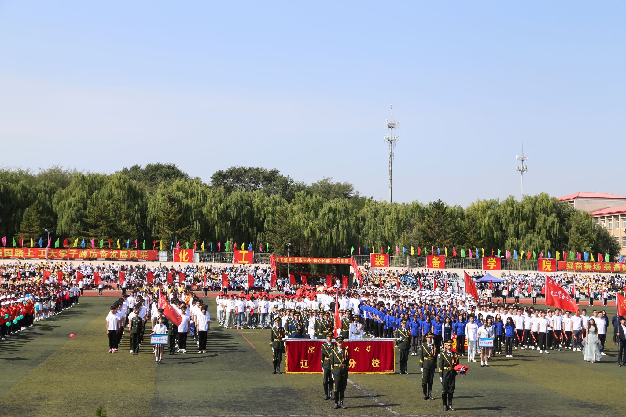 運(yùn)動(dòng)會(huì)在激昂的《運(yùn)動(dòng)員進(jìn)行曲》中拉開(kāi)帷幕。在中央校區(qū),國(guó)旗方隊(duì)、校旗方隊(duì)、校訓(xùn)方隊(duì)、花束方隊(duì)、旗海方隊(duì)、裁判員方隊(duì)以及各單位代表隊(duì)依次進(jìn)入運(yùn)動(dòng)場(chǎng)。在遼陽(yáng)分校,國(guó)旗方隊(duì)、紅旗方隊(duì)、裁判員方隊(duì)以及各單位代表隊(duì)依次進(jìn)入運(yùn)動(dòng)場(chǎng)。入場(chǎng)式上,師生們列隊(duì)整齊、口號(hào)鏗鏘,英姿颯爽、朝氣蓬勃,充分展示學(xué)校守正創(chuàng)新、奮發(fā)進(jìn)取的精神文化,各方隊(duì)以充滿(mǎn)創(chuàng)意的表演,展現(xiàn)出各學(xué)院、部門(mén)特色和師生良好的精神面貌,呈現(xiàn)了異彩紛呈的開(kāi)幕式展演。