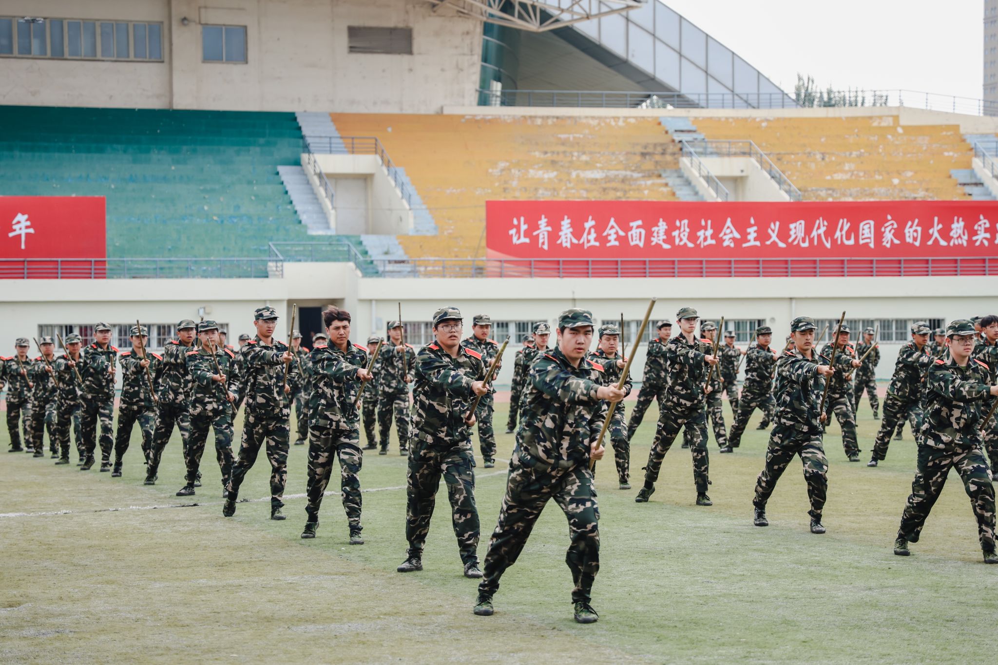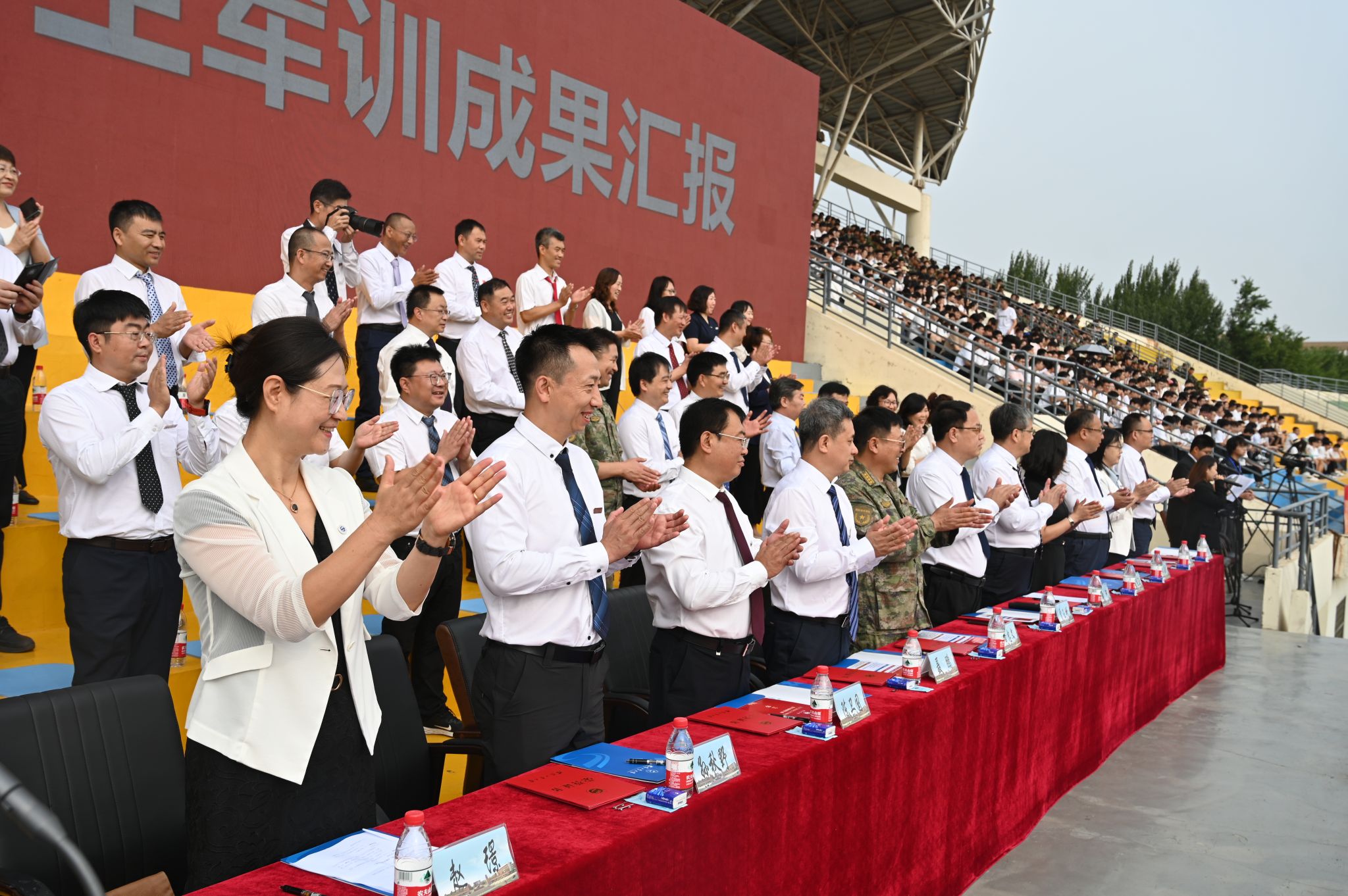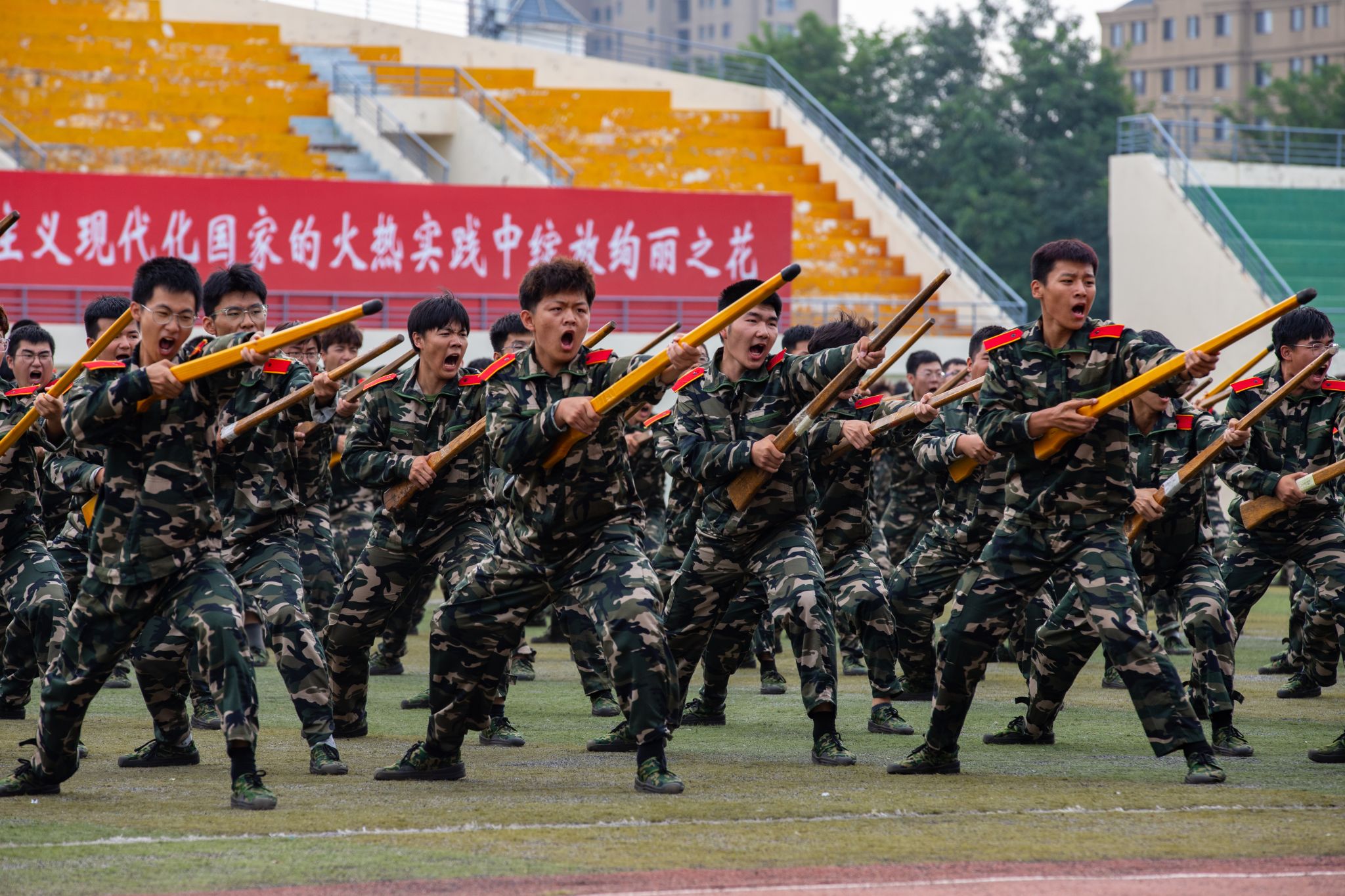 兩千多名參訓學員進行了刺殺操、擒敵拳、應急棍、匕首操、軍體拳、擒拿格斗、戰術、愛國愛校操等軍訓科目表演。他們精神抖擻,英姿勃發,一招一式動作果斷、步調一致,充分展現了入學以來的訓練成果和青春朝氣,不時贏得現場師生的陣陣掌聲。
