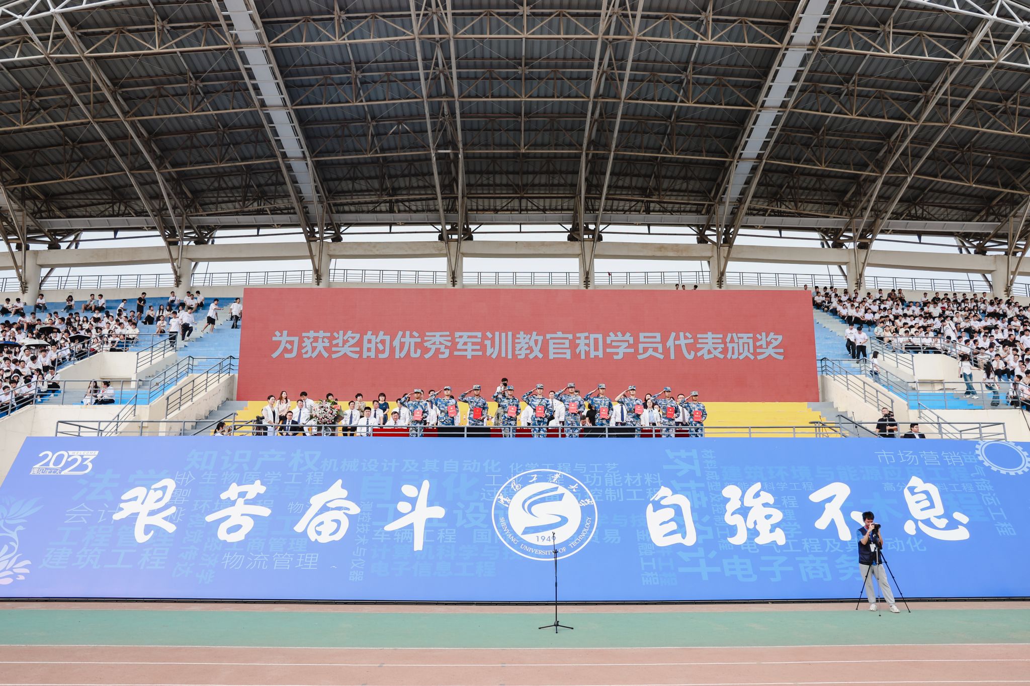 9月8日,中央校區2023級學生開學典禮暨軍訓成果匯報會在南區體育場舉行。遼寧省軍區戰備建設局大校副局長黃忠文,校領導賈玉明、張珂、聶鵬、陳延明、陳衛國、柯麗、孫秋野、臧喜民出席大會,黨委副書記趙璟主持會議。學校相關職能部門負責人、各二級學院黨政負責人、學生工作干部、軍訓教官、2023級全體學生參加大會。