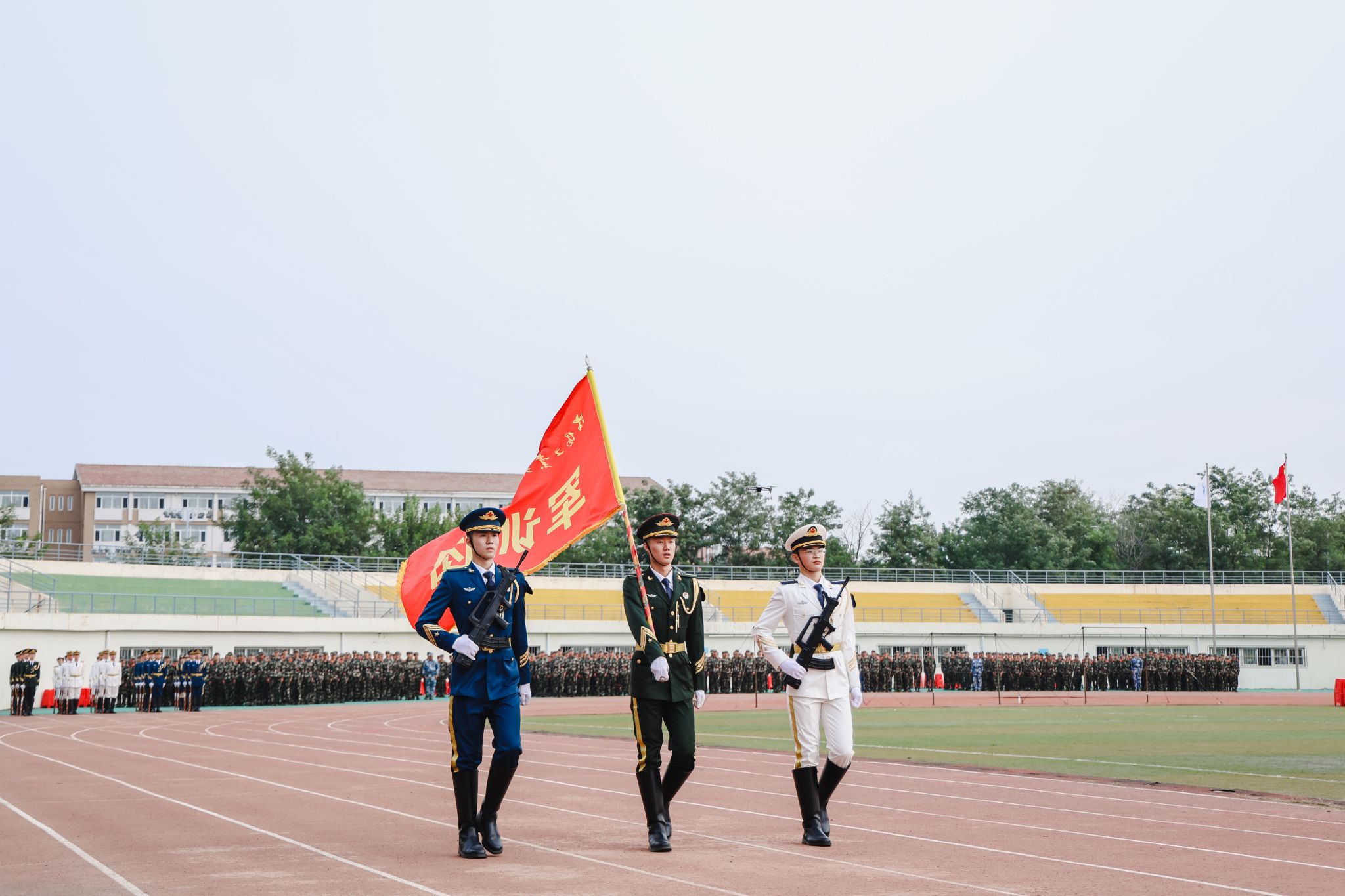 典禮前,進行了軍訓成果匯報。各學院學生工作負責人與新生輔導員擔任分列式領隊,同2023級學生一起步伐整齊、口號嘹亮,精神飽滿地通過主席臺,接受檢閱。